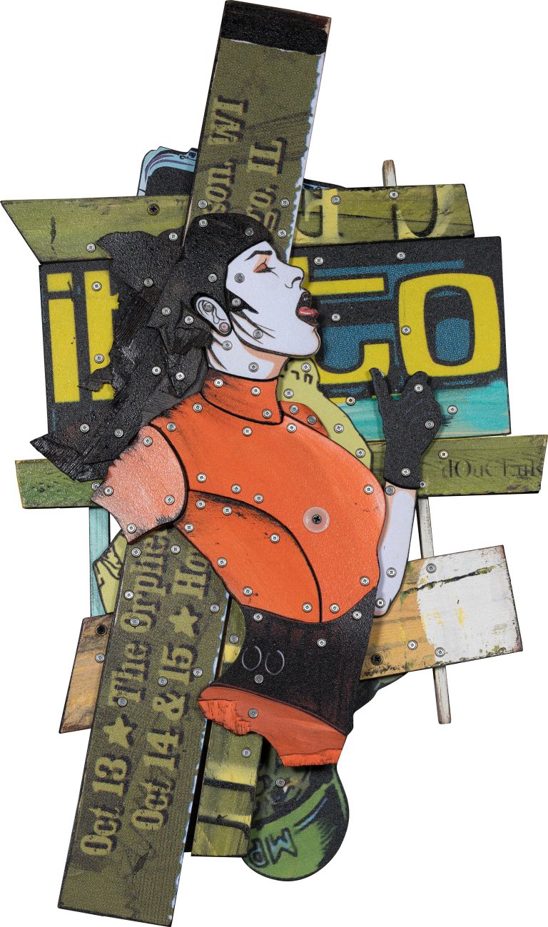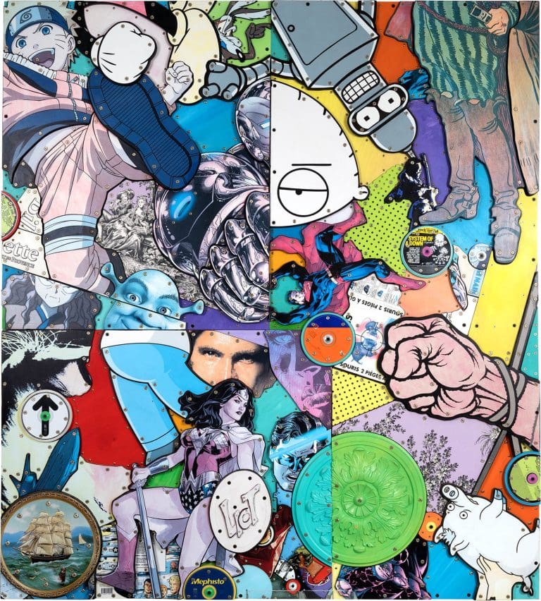 Eric Liot (né en 1968) est un artiste français dont l’œuvre hybride croise assemblage, bas‑relief peint et sculpture. Issu d’une culture pop et urbaine, il découpe, superpose et peint bois, cartons, objets trouvés et matériaux industriels pour composer des tableaux‑objets vibrants. Ses pièces convoquent icônes de la bande dessinée, du cinéma et de la publicité, ainsi que des signes vernaculaires (enseignes, typographies), qu’il recompose en narrations fragmentées. La frontalité des aplats, les contours nets et les textures du support confèrent à ses œuvres une physicalité immédiate, entre affiche lacérée et totem domestique.